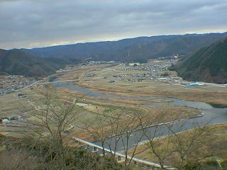 津山から流れる吉井川(手前左手が津山方面)と美作町・湯郷温泉(中央奥へ12キロ)